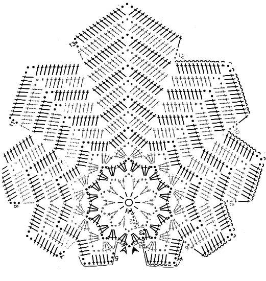 Round 13: 3 ch, skip 2 dc, 10 dc in 10 dc, 3 dc in arch, 3 ch, 3 dc in same arch, 10 dc in 10 dc, skip 2 dc, dc.
