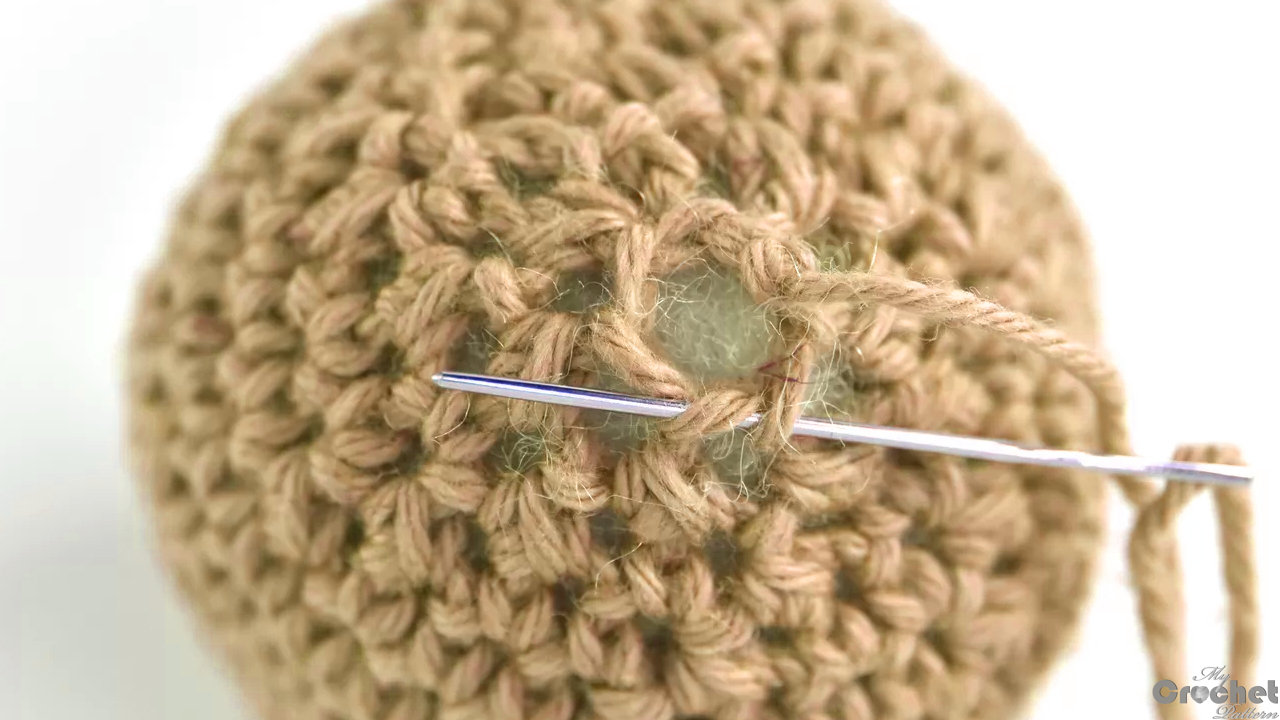 Continue decreasing the stitches until you have six stitches left. Cut your yarn, leaving an 8-inch tail. End off the last stitch, then use a yarn needle to run the tail through the stitches and gather the opening closed.