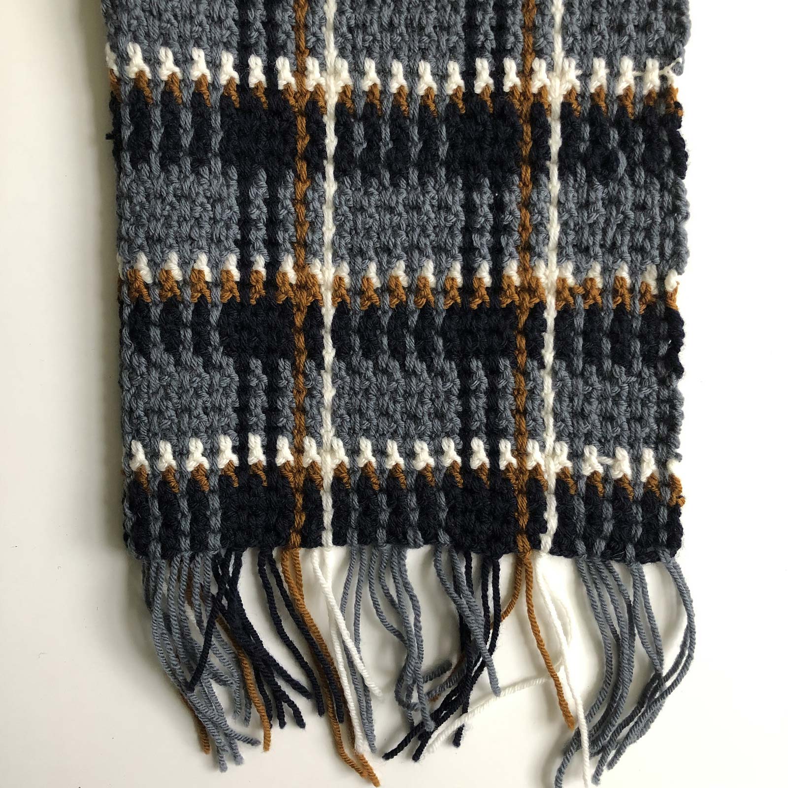 - Gauge: 24 stitches and 16 rows = 4″ in finished plaid