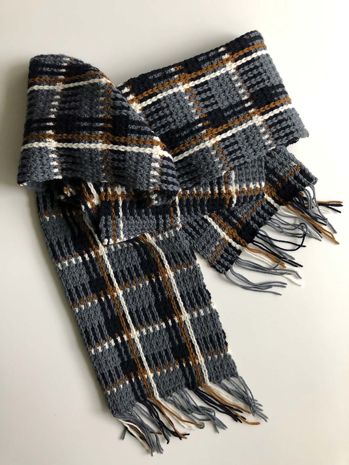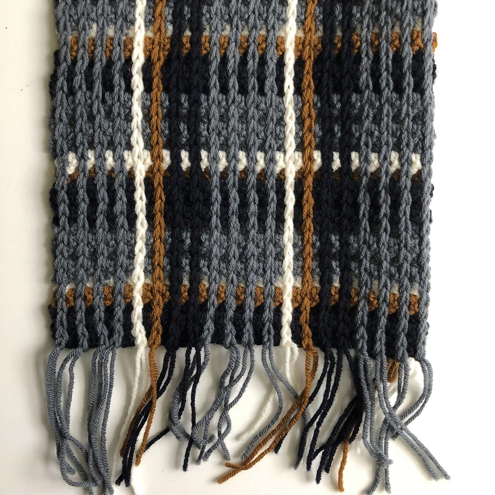 - Gauge: 24 stitches and 16 rows = 4″ in finished plaid